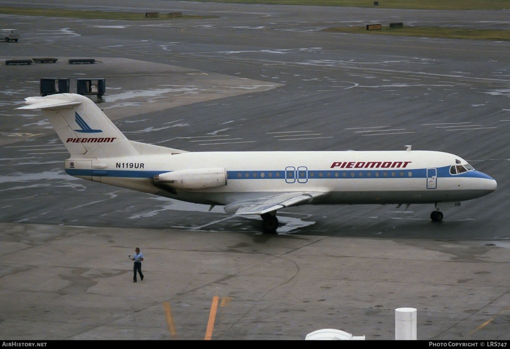 Piedmont Airlines Fokker 28-4000, N119UR, is shown at Boston on June 12, 1987.