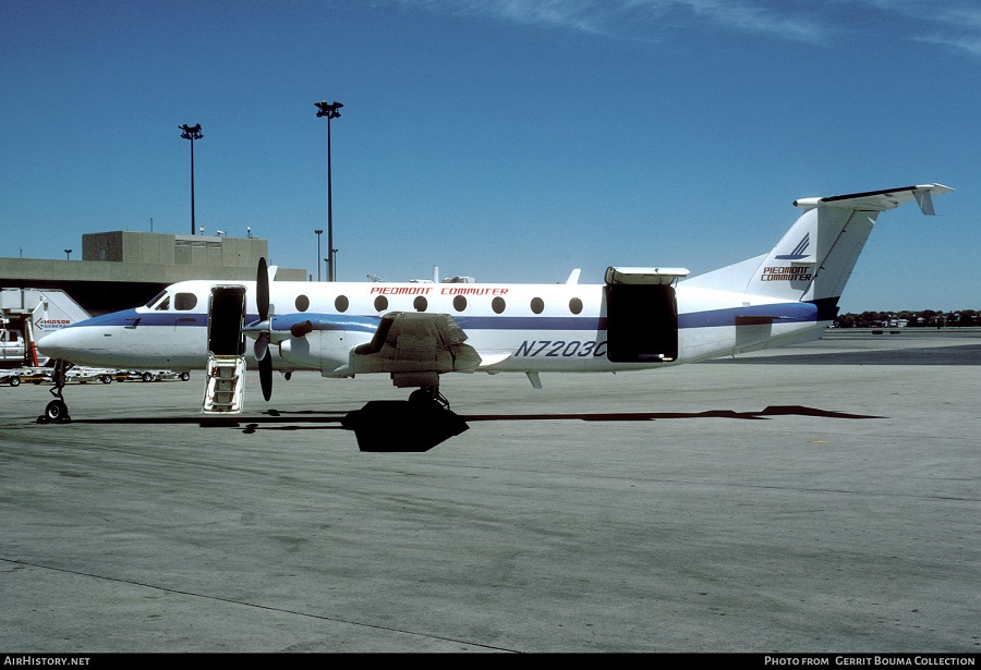 Brockway Air Beech 1900C, N7203C, is shown in Piedmont Commuter System colors in May 1986.