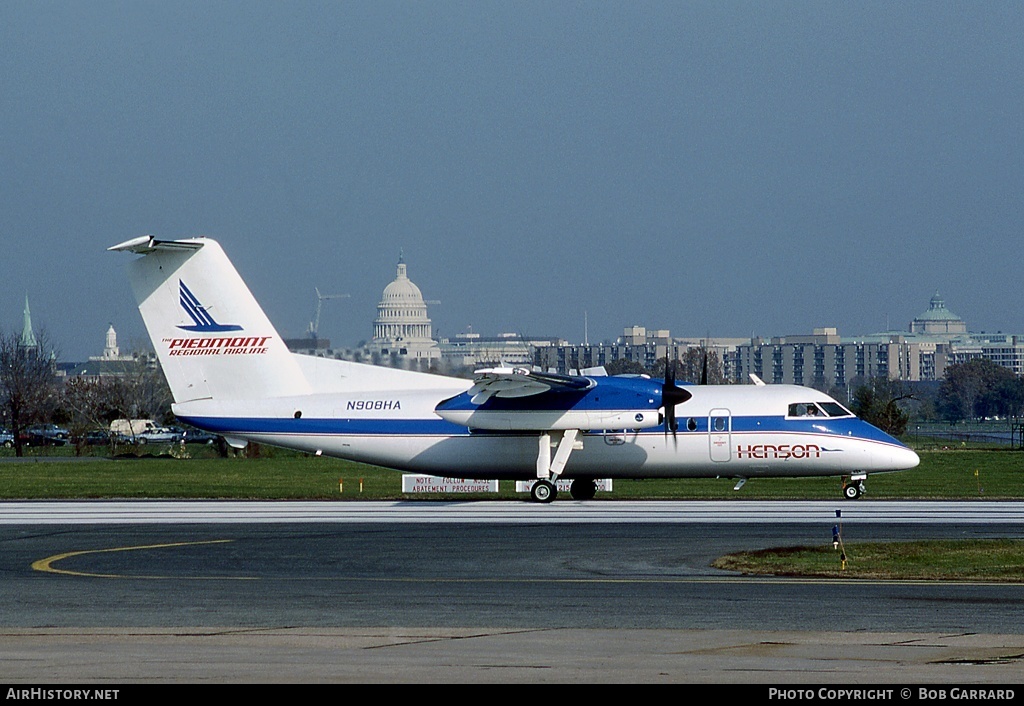 Henson Airlines De Havilland Canada DHC-8-102 Dash 8, N908HA, is shown wearing Piedmont Regional Airline colors at Washington National Airport in November 1985.