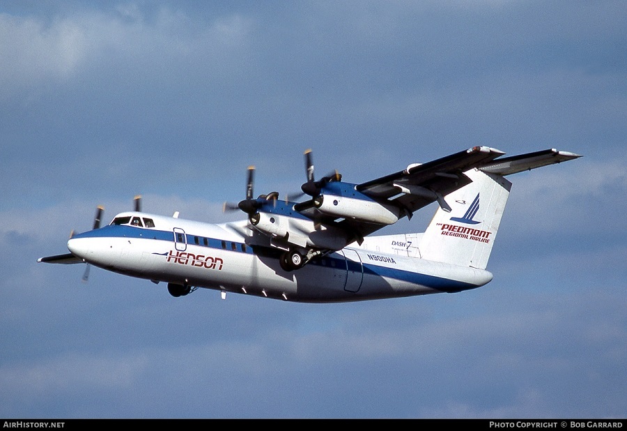 Henson Airlines De Havilland Canada DHC-7-102 Dash 7, N900HA, is shown wearing Piedmont Regional Airlines colors while departing Washington National Airport in June 1985.