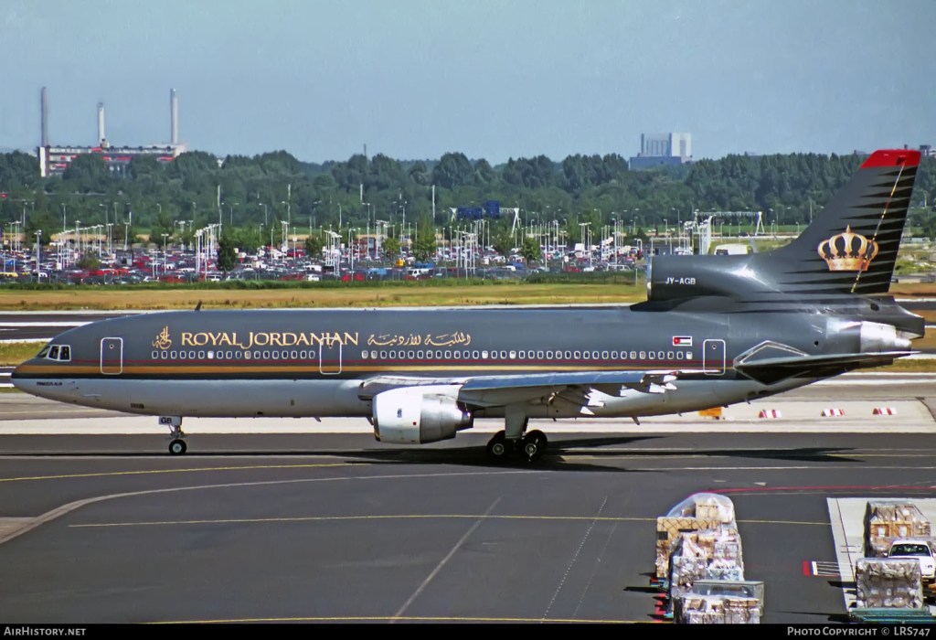 Royal Jordanian Airlines Lockheed L-1011-385-3 TriStar 500, JY-AGB, is shown at Amsterdam on April 27, 1995.