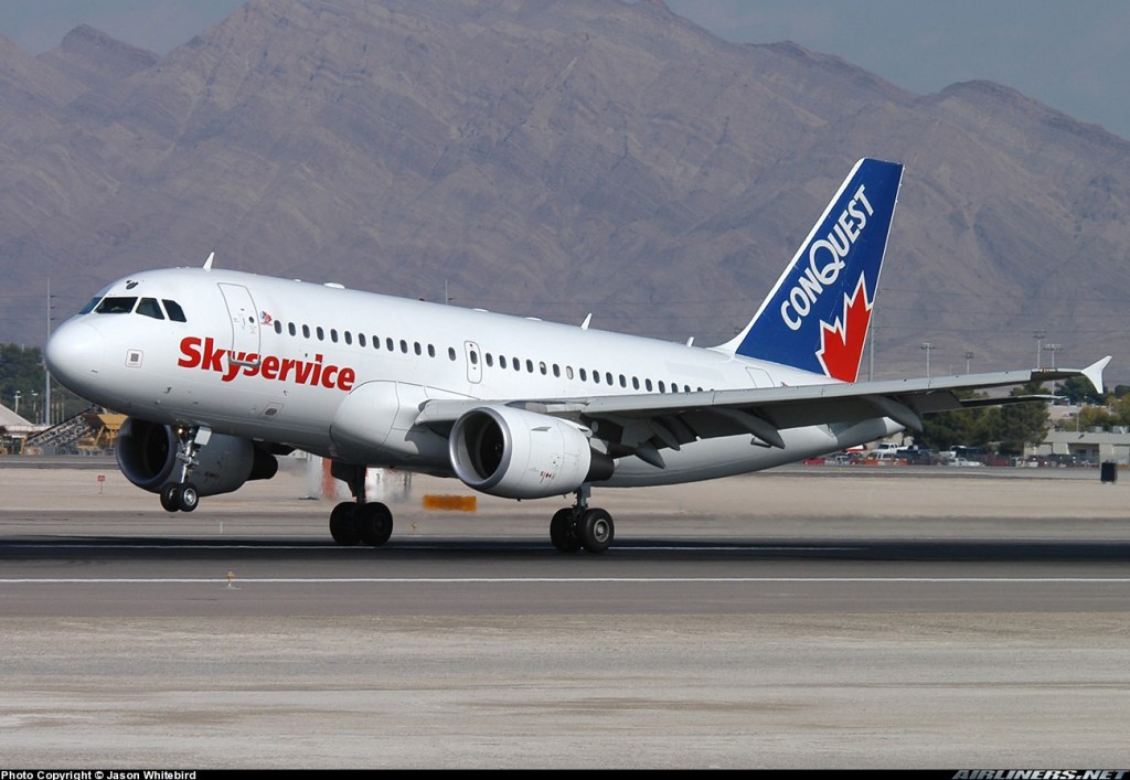 Skyservice Airlines Airbus A319-112, C-GTDT, is shown operating on behalf of Conquest Vacations at Las Vegas on November 11, 2004.