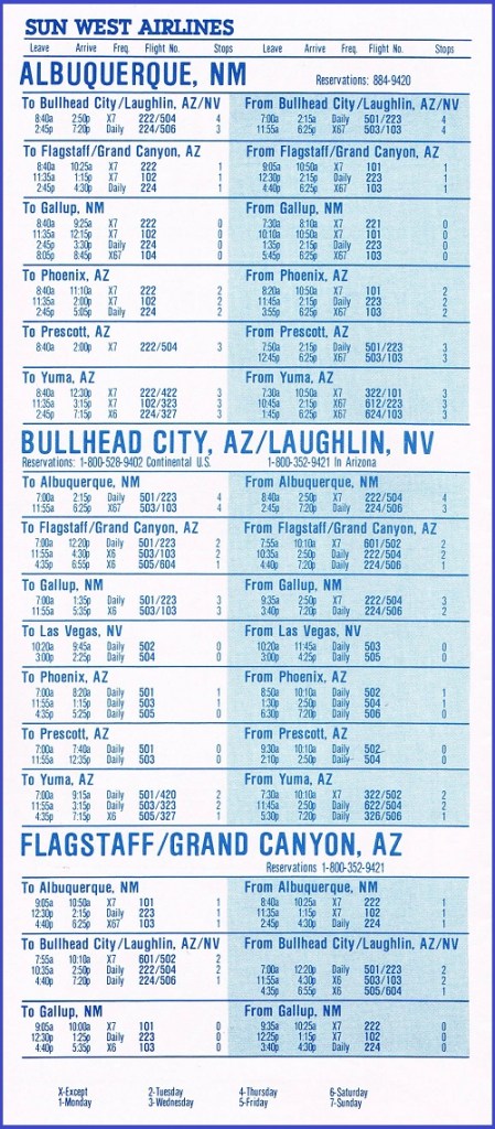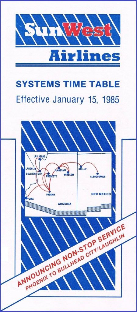 SunWest Airlines January 15, 1985 System Timetable PREVIOUS PAGE MAIN PAGE Share this: Click to share on X (Opens in new window) X Click to share on Facebook (Opens in new window) Facebook Like Loading...