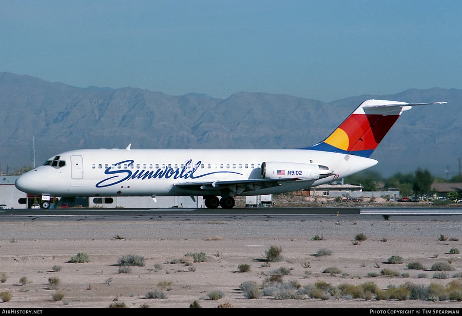 Sunworld International Airways McDonnell Douglas DC-9-14, N9102, is shown at Las Vegas on November 10, 1987.