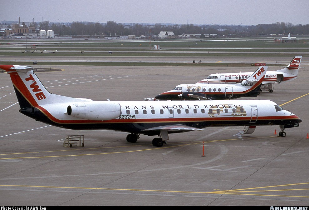 Trans States Airlines Embraer EMB-145ER, N802HK, is shown in Trans World Express colors at Saint Louis on November 11, 2000.