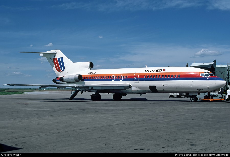 United Airlines Boeing 727-22, N7068U, is shown at Calgary on June 10, 1986 wearing the carrier’s 1974-introduced livery.