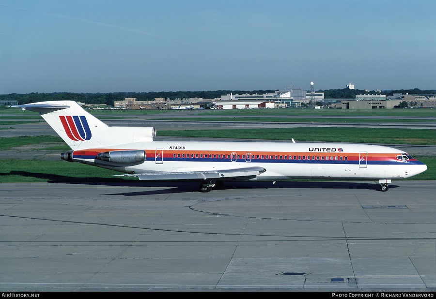United Airlines Boeing 727-222, N7465U, is shown at Cleveland on June 18, 1986.