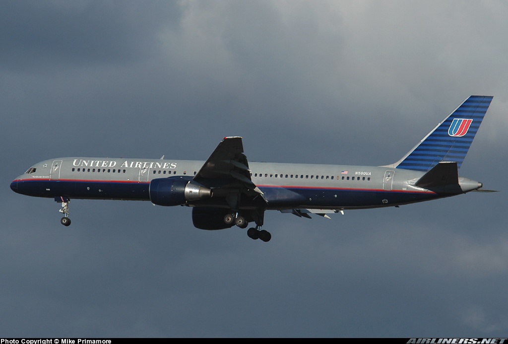 United Airlines Boeing 757-222, N580UA, is shown arriving at Newark on June 18, 2005 wearing the carrier’s 1993-introduced livery.