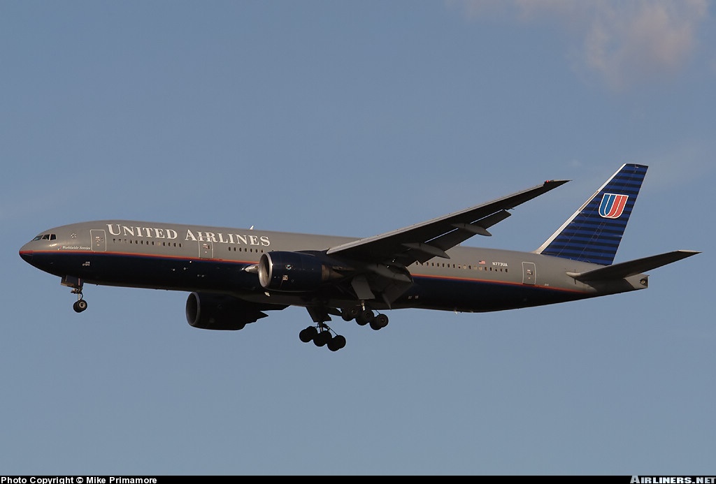 United Airlines Boeing 777-222/ER, N221UA, is shown at San Francisco on December 19, 2009 wearing the carrier’s 2004-introduced livery.