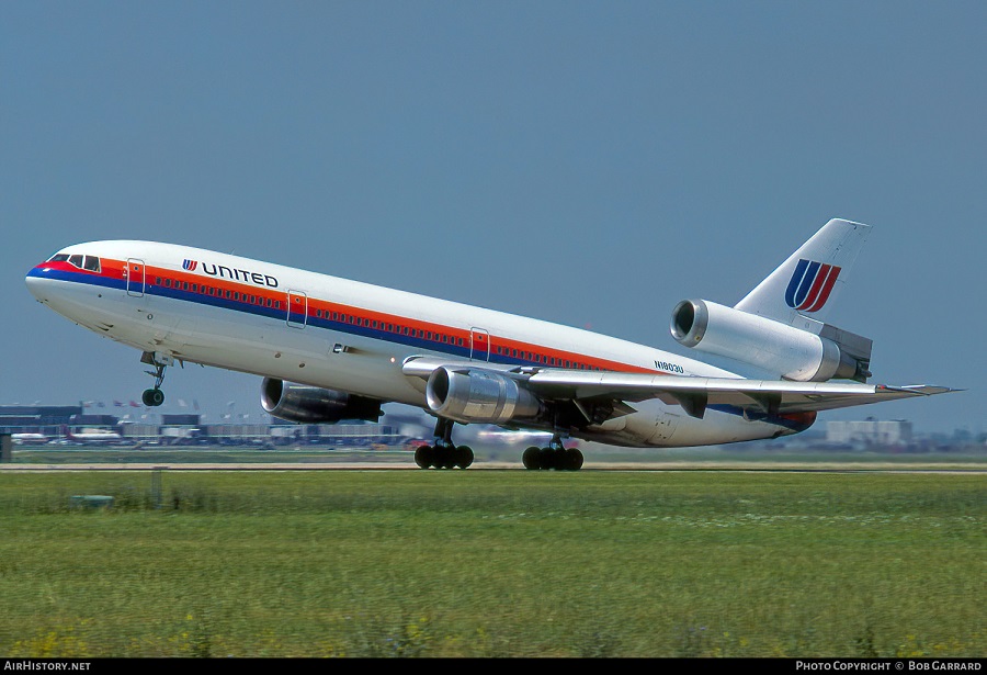 United Airlines McDonnell Douglas DC-10-10, N1803U, is shown departing Chicago O’Hare in June 1977 wearing the carrier’s 1974-introduced livery.
