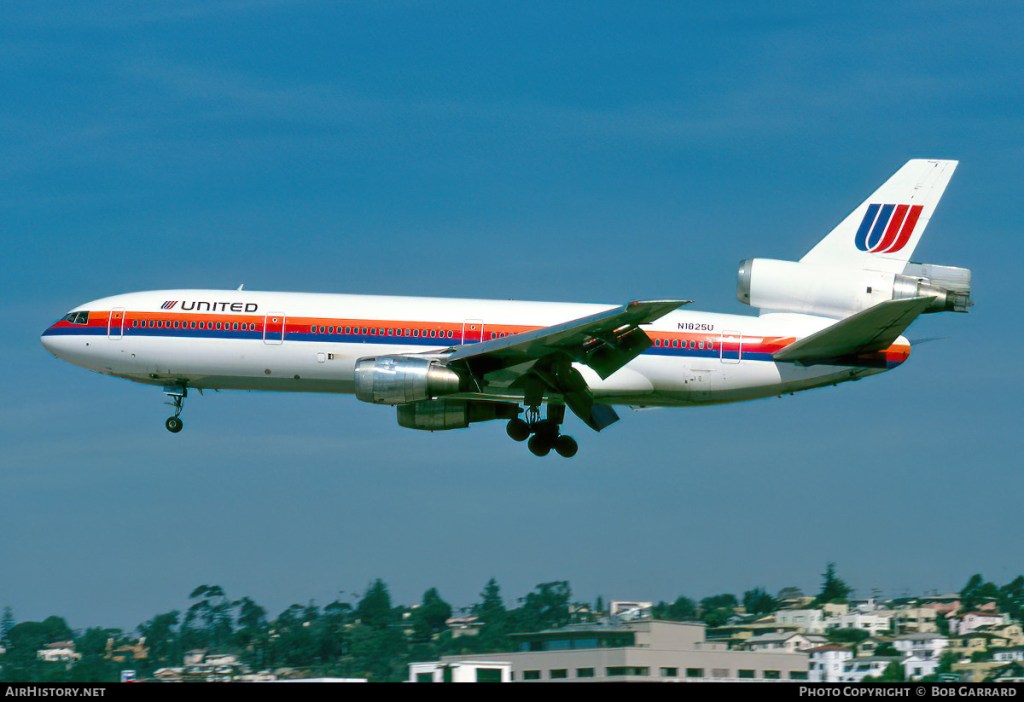 United Airlines McDonnell Douglas DC-10-10, N1825U, is shown arriving at San Diego in January 1979 wearing the carrier’s 1974-introduced livery.