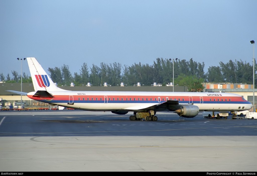 United Airlines McDonnell Douglas DC-8-71, N8076U, is shown at Miami on April 29, 1990 wearing the carrier’s 1974-introduced livery.
