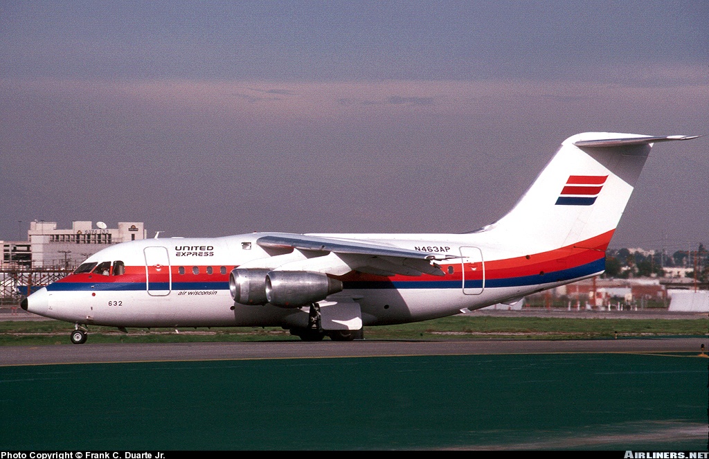 Air Wisconsin British Aerospace BAe-146-100, N463AP, is shown wearing its original United Express livery at Los Angeles in March 1993.