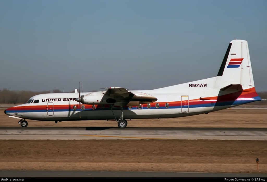 Air Wisconsin F-27-500 Friendship, N501AW, is shown in United Express colors at Chicago O’Hare Airport on April 1, 1987.