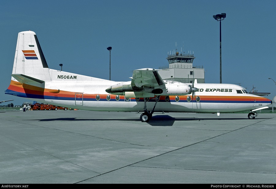 Air Wisconsin F-27-500 Friendship, N506AW, is shown in United Express colors at Champaign/Urbana in October 1988.