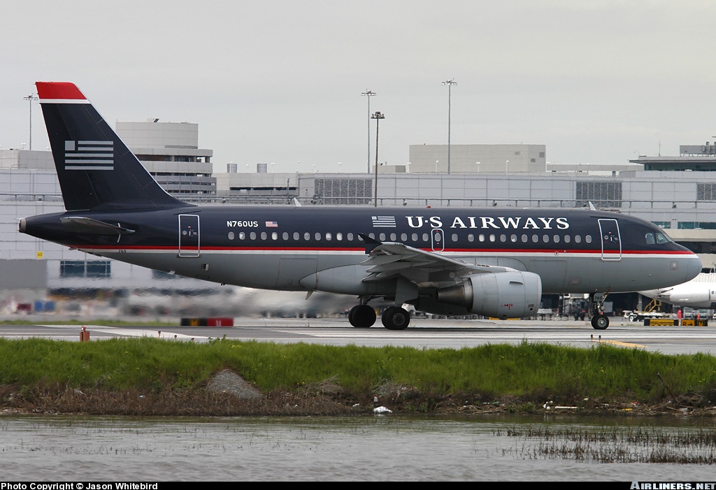 US Airways Airbus A319-112, N760US, is shown at San Francisco on February 21, 2004.