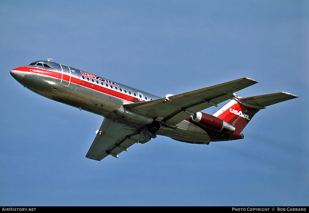 USAir British Aerospace BAC 111-204AF One-Eleven, N2111J, is shown departing Washington National Airport in July 1984.