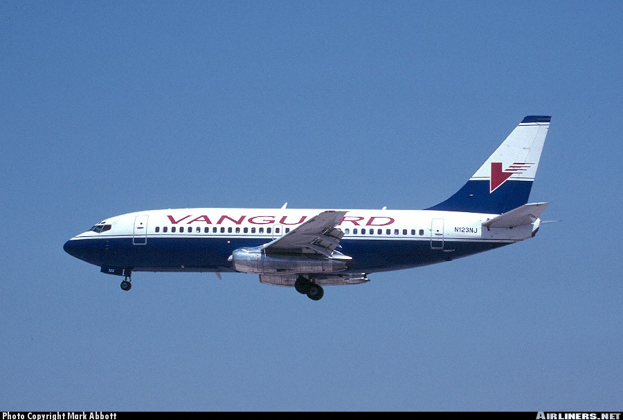 Vanguard Airlines Boeing 737-230, N123NJ, is shown arriving at Los Angeles on August 25, 2001 wearing the carrier’s 1997-introduced livery.