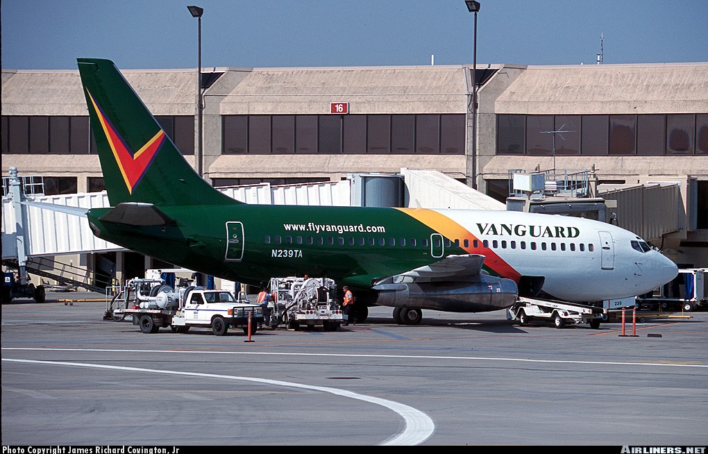 Vanguard Airlines Boeing 737-25A, N239TA, is shown at Kansas City in October 2001 wearing the livery introduced by the carrier earlier that year.