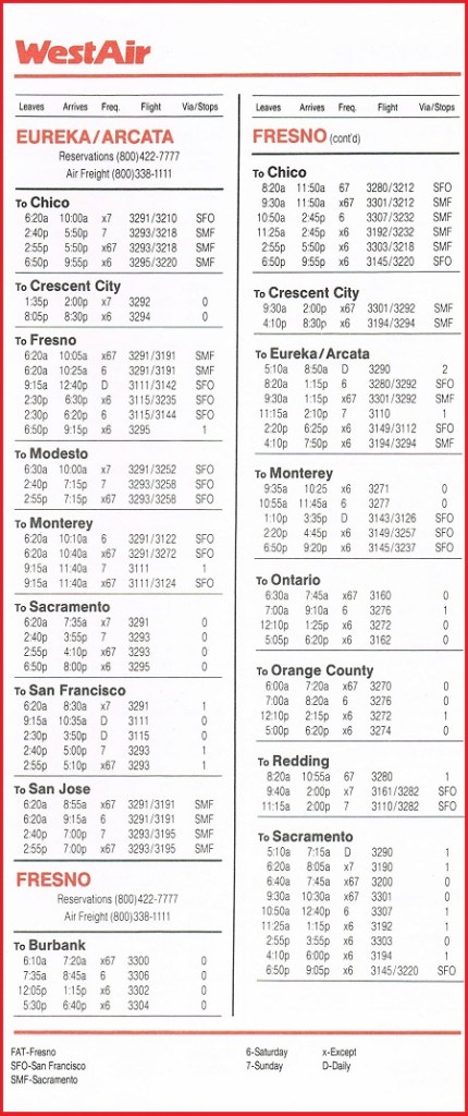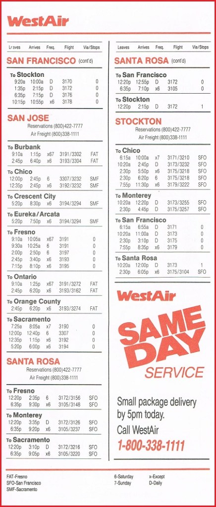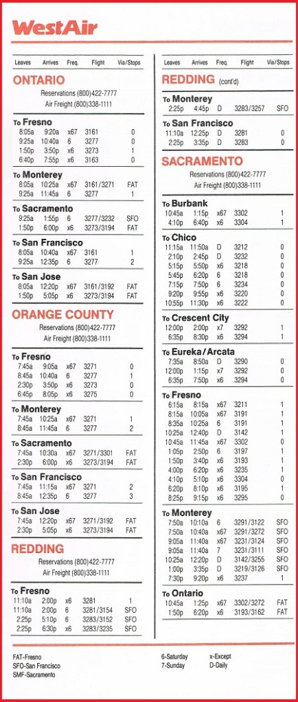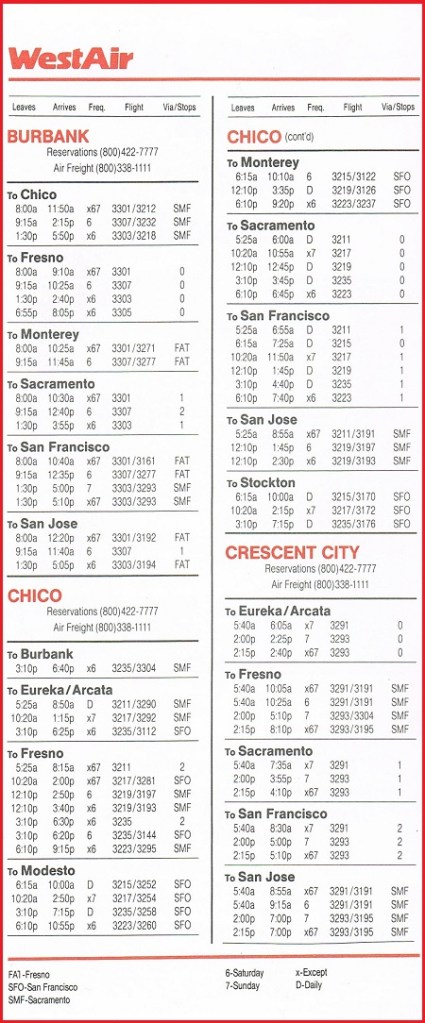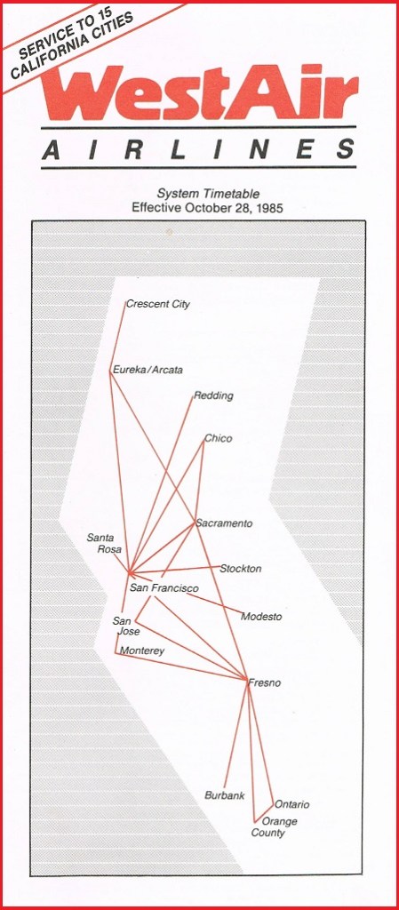 WestAir Commuter Airlines October 25, 1985 System Timetable PREVIOUS PAGE MAIN PAGE Share this: Click to share on X (Opens in new window) X Click to share on Facebook (Opens in new window) Facebook Like Loading...